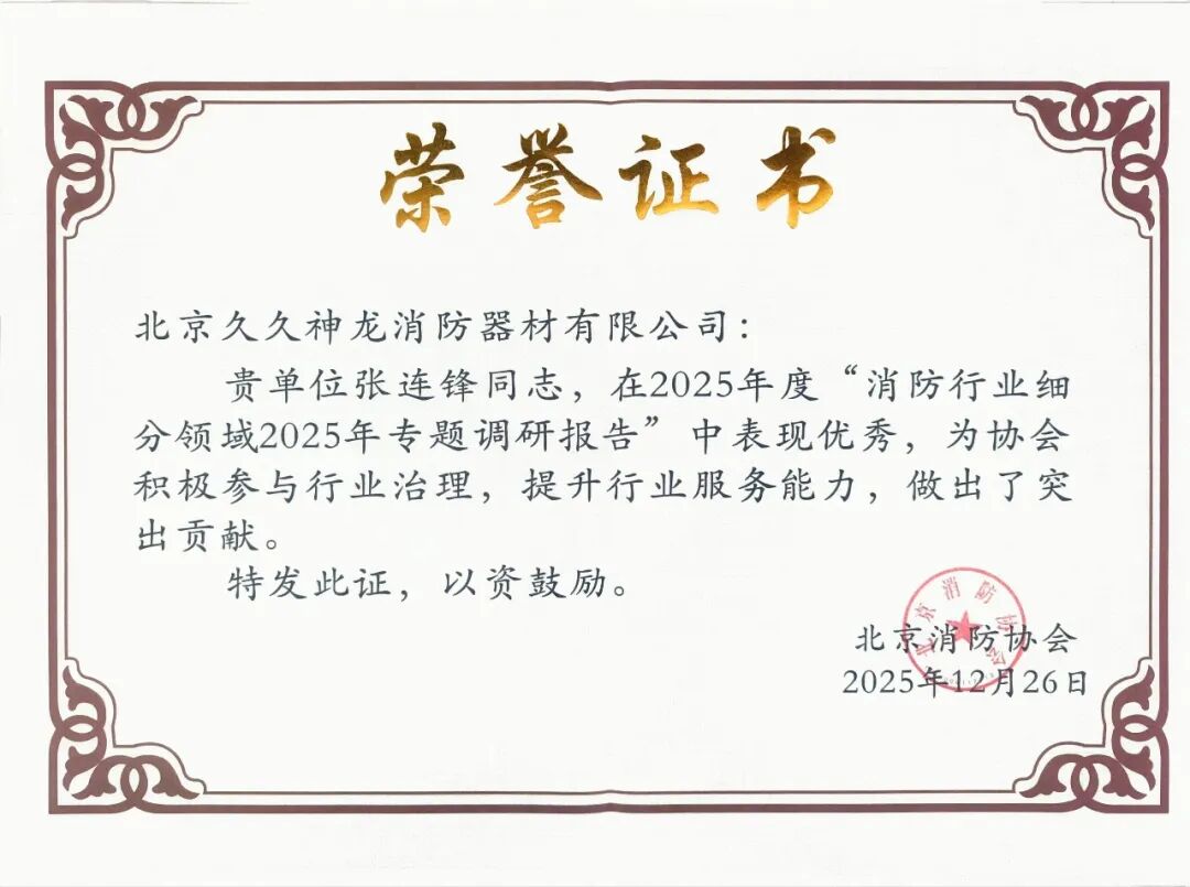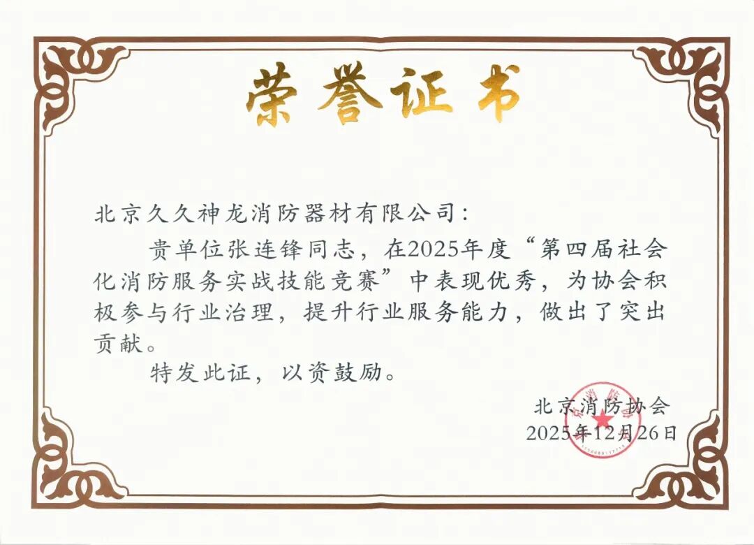 北京久久神龙消防器材有限公司产品中心技术研发部经理张连锋在本次会议上获得北京消防协会“消防行业细分领域2025年专题调查研究”突出贡献奖与“第四届社会化消防服务实战技能竞赛”突出贡献奖,两项殊荣。